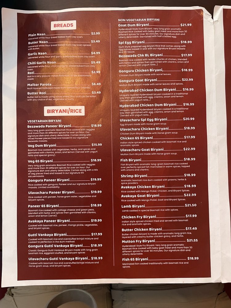 Hyderabadi style dum biryani. Very long grain aromatic basmati rice cooked with veggies and more than 30 different spices for over an hour. Our signature dish and utterly delectable. Gluten free.